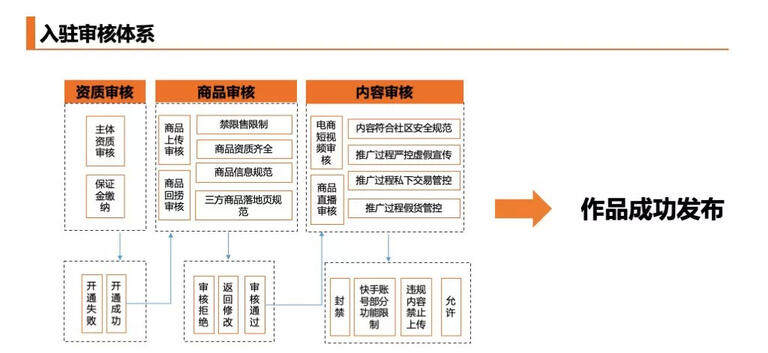 从上图来看,快手电商的入驻审核体系除了和电商平台一样都有资质和商品审核之外,在内容审核方面也在持续强化。